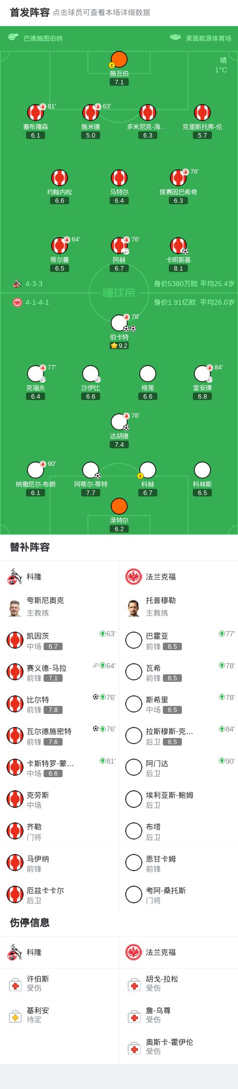 北京时间11月23日德国足球顶级联赛 联赛 第11轮,科隆主场对阵法兰克福。科隆卡明斯基破门,比尔特破门,瓦尔德施密特破门。法兰克福阿蒂尔-蒂特破门,达胡德破门,伯卡特梅开二度。最终比分科隆 3-4 法兰克福。